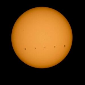 The International Space Station may be the size of a football field, but its tiny silhouette looks almost ant-like as it crosses in front of the sun in an image released this week by NASA.
